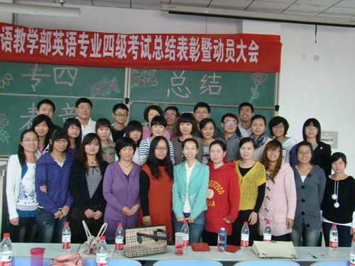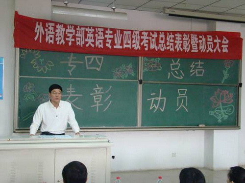 2011年10月22日 星期六上午9时,济宁医学院外语系英语专业四级考试总结表彰暨动员大会在C416隆重召开。外语系主任孔庆胜教授、外语系综合科任和、外语系陶丽君、韩冰、李丽、段梅清、李红梅、王丽媛等专业老师,辅导员杜现娟出席了本次会议。外语系2009、2010和2011级英语专业全体同学参加了会议。