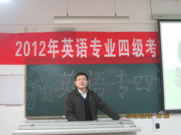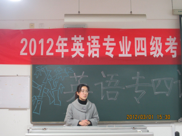 2012年3月1日下午2:00,外语系2012年英语专业四级考前辅导暨动员大会在A416教室举行。本次大会邀请了曲阜师范大学翻译学院的陈晓霞老师为大家做了有针对性的考前备战指导,外语教学部综合科任和老师、全体专业老师以及2010级、2011级英语专业全部同学参加了本次大会。