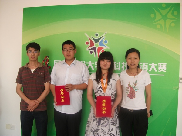 5月25日 ,由山东省科协、山东省教育厅主办的“第四届山东省大学生科技外语大赛”在山东交通学院(长清校区)圆满落下帷幕。我校外语系2009级英语专业学生张莹,凭借其扎实的语言知识基础、流畅的英语口语和良好的竞技水平,在复赛中成绩突出,获得大赛专业组排名第十,二等奖中排名第一的好成绩;我部教师袁国廷获得“优秀指导教师”的荣誉称号。