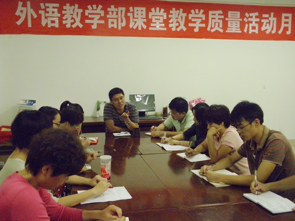 刘冰老师以学院人才培养目标为指导,并结合了四级考试这一目标,分别从教学思想,教学内容确定,教学环节和教学过程设定等几个方面进行了一次精彩的解说。说课结束后,孔庆胜主任及全体教师进行了讨论评议,认为:刘冰老师在以提高学生听说读写能力的基础上,充分结合了四级考试综合项目的训练,在教学过程中通过课堂互动、课堂讨论等不同的方式,让学生参与教学,提高了学生自主探究的能力;同时也大大地提高了学生的表达与沟通的能力。各位老师对这种以提高学生各项能力为基础并结合四级考试专项训练的教学方式给予了积极的肯定,纷纷表示要进行借鉴,并提出了一些宝贵的实施意见及建议。