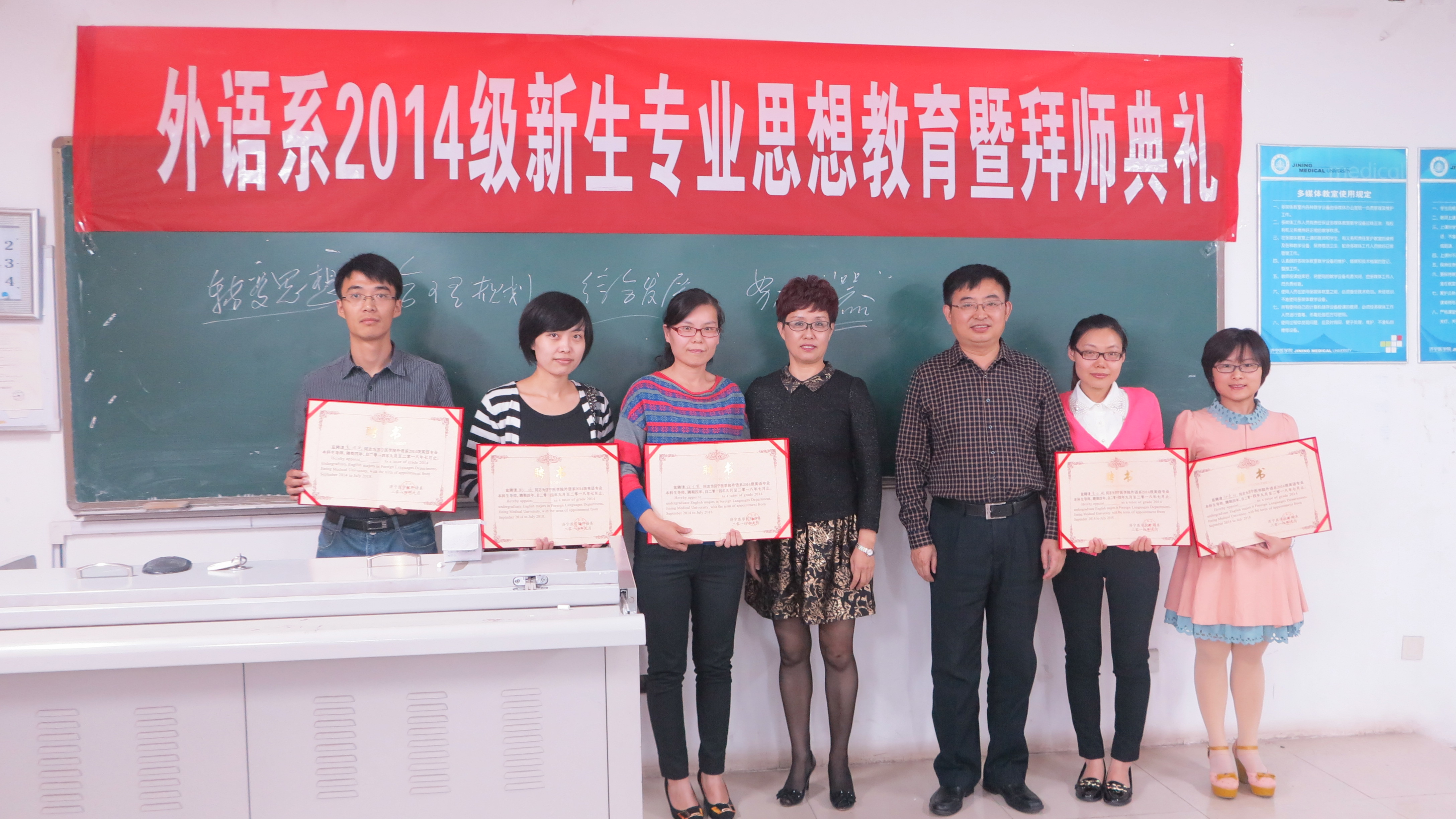 917日下午4:30,外语系在A416教师隆重举行2014级新生导师聘任仪式暨拜师典礼。外语系党总支书记王传功教授、副主任陈培君副教授、全体专业老师以及2014级新生参加了本次活动。