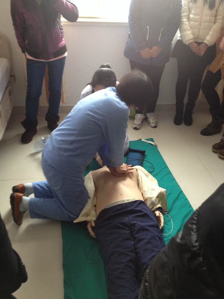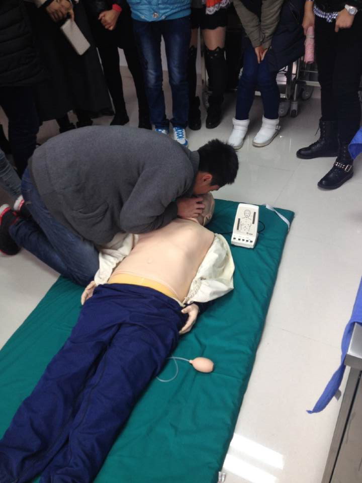 在急症科老师的讲解和示范下,学生主要进行了单人、双人心肺复苏和和除颤等急救知识实训,之后大家分组根据带教老师的指导对模拟人实施心肺复苏术。