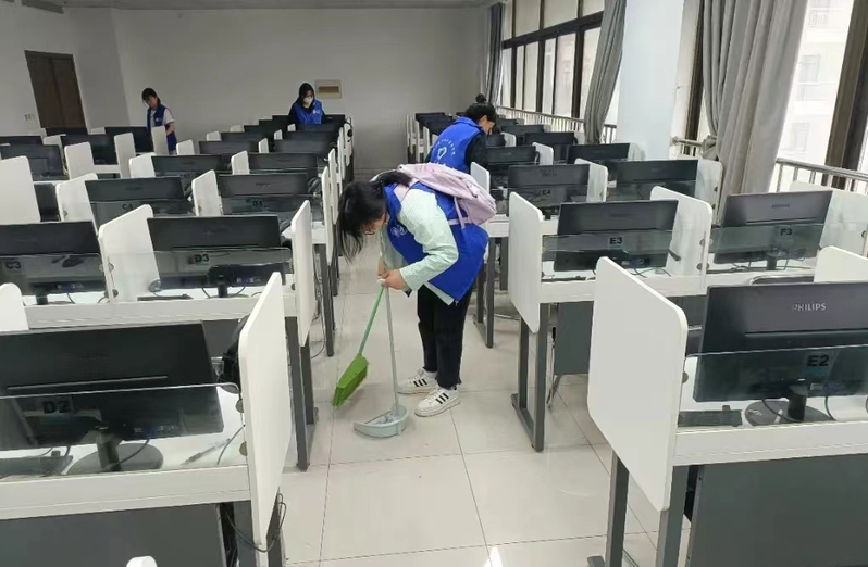 志愿者们分工明确,密切配合,干劲十足,对语音室和会议室等教学场所的桌椅、讲台、窗户、地面等卫生区进行重点清洁工作。活动过程中,志愿者手拿扫帚、拖把、抹布等卫生工具认真清扫每个角落,确保不留死角。经过大家的辛勤劳动,教学区域窗明几净,焕然一新,为广大师生营造了一个干净而舒适的学习环境。